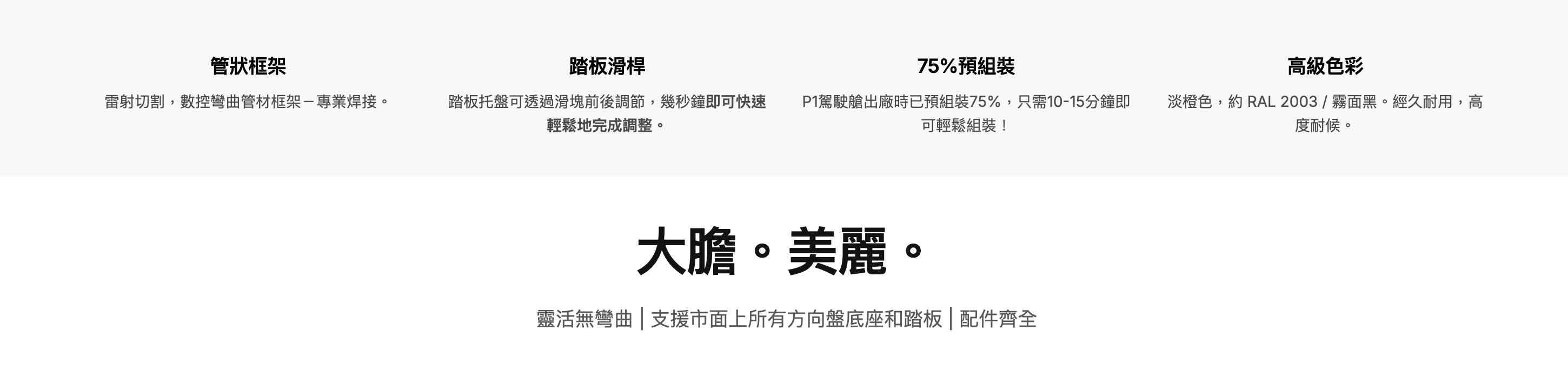 - 全方位可調式底座,包括方向盤、踏板、座椅、附件位置 與 座椅/踏板前後滑動(含滑軌)