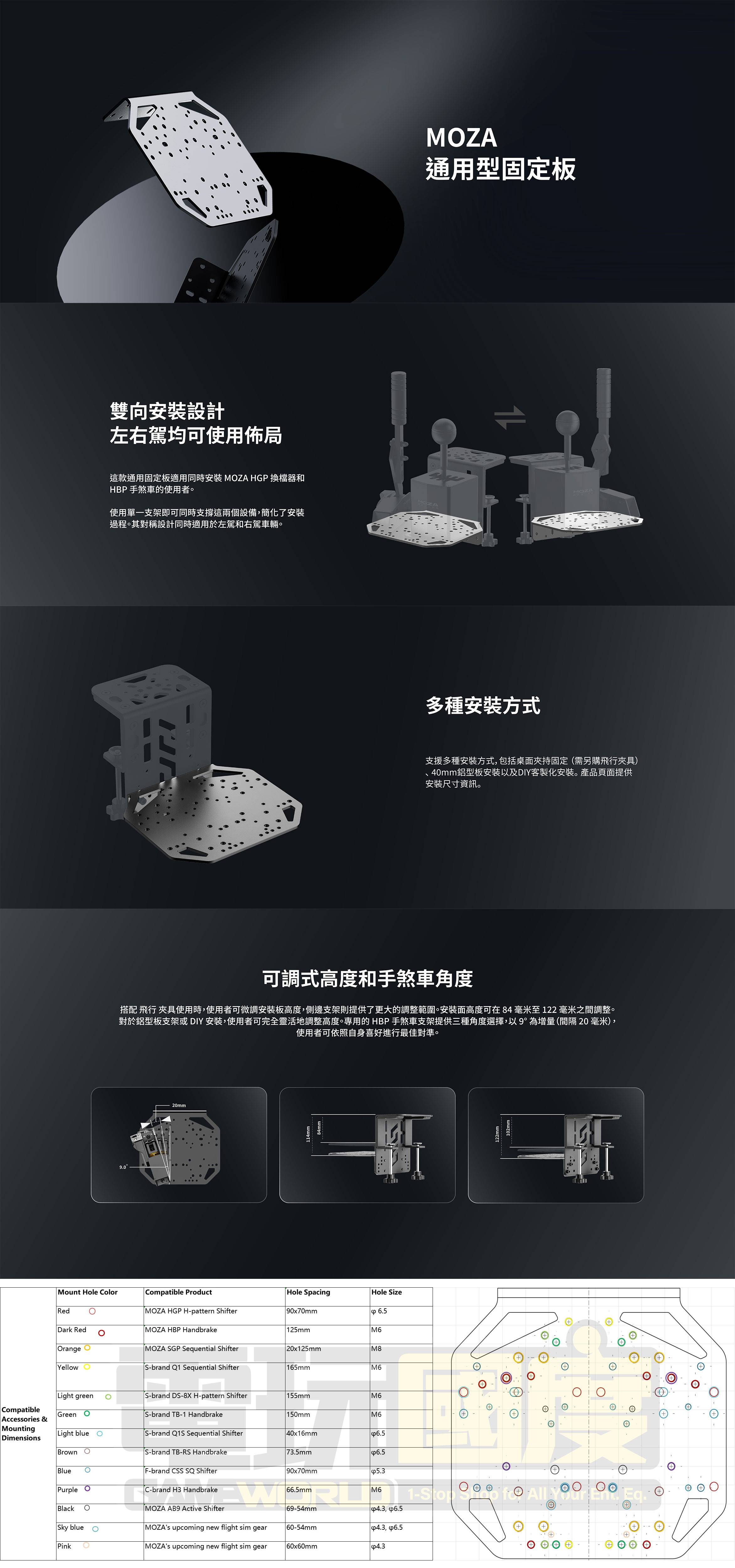 使用單一左右手通用的支架即可安裝換檔桿和手煞車。此支架高度和手煞車角度均可調節,提供多種安裝方式——包括桌面安裝、側裝支架和DIY安裝——並廣泛兼容MOZA及部分第三方產品,所有功能均採用耐用的鋼製結構。